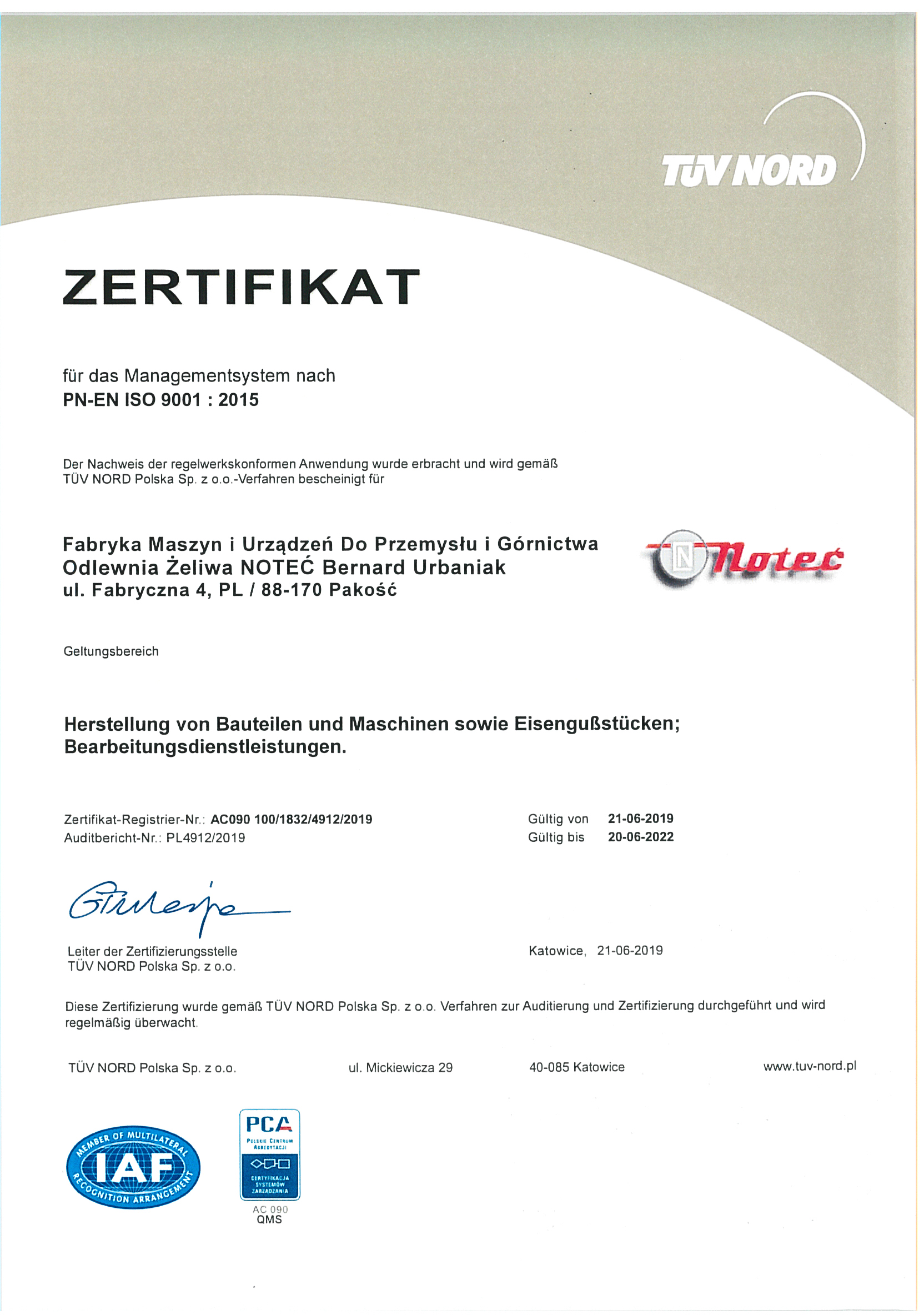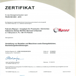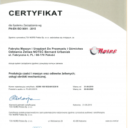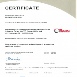 W wyniku prac przeprowadzonych w zakresie systememu zarządzania jakością potwierdzonych audytem przeprowadzonym przez TUV NORD Polska nasza firma uzyskała w dniu 21.06.2019 certyfikat PN-EN ISO 9001 : 2015 w zakresie: produkcja części i maszyn oraz odlewów żeliwnych oraz usługi obróbki mechanicznej.